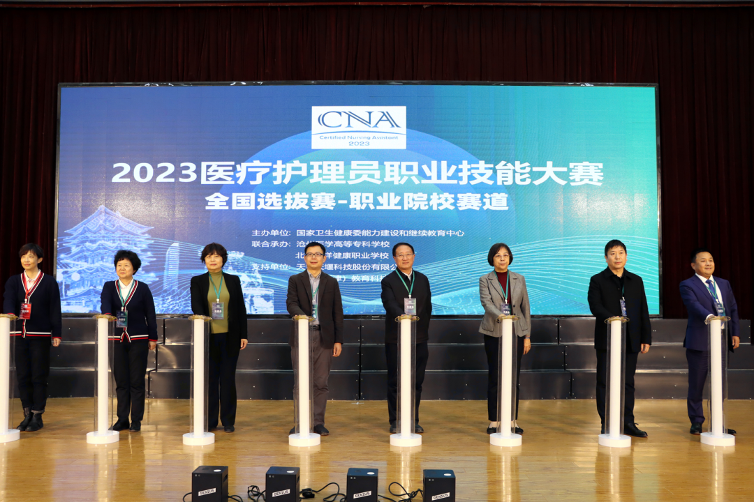 2023年12月1日,由国家卫生健康委能力建设和继续教育中心主办,沧州医学高等专科学校、北京百洋健康职业学校联合承办,星空平台、慧医(天津)教育科技有限公司等单位协办的首届医疗护理员职业技能大赛(职业院校赛道)全国选拔赛开幕式在沧州医学高等专科学校隆重举行。